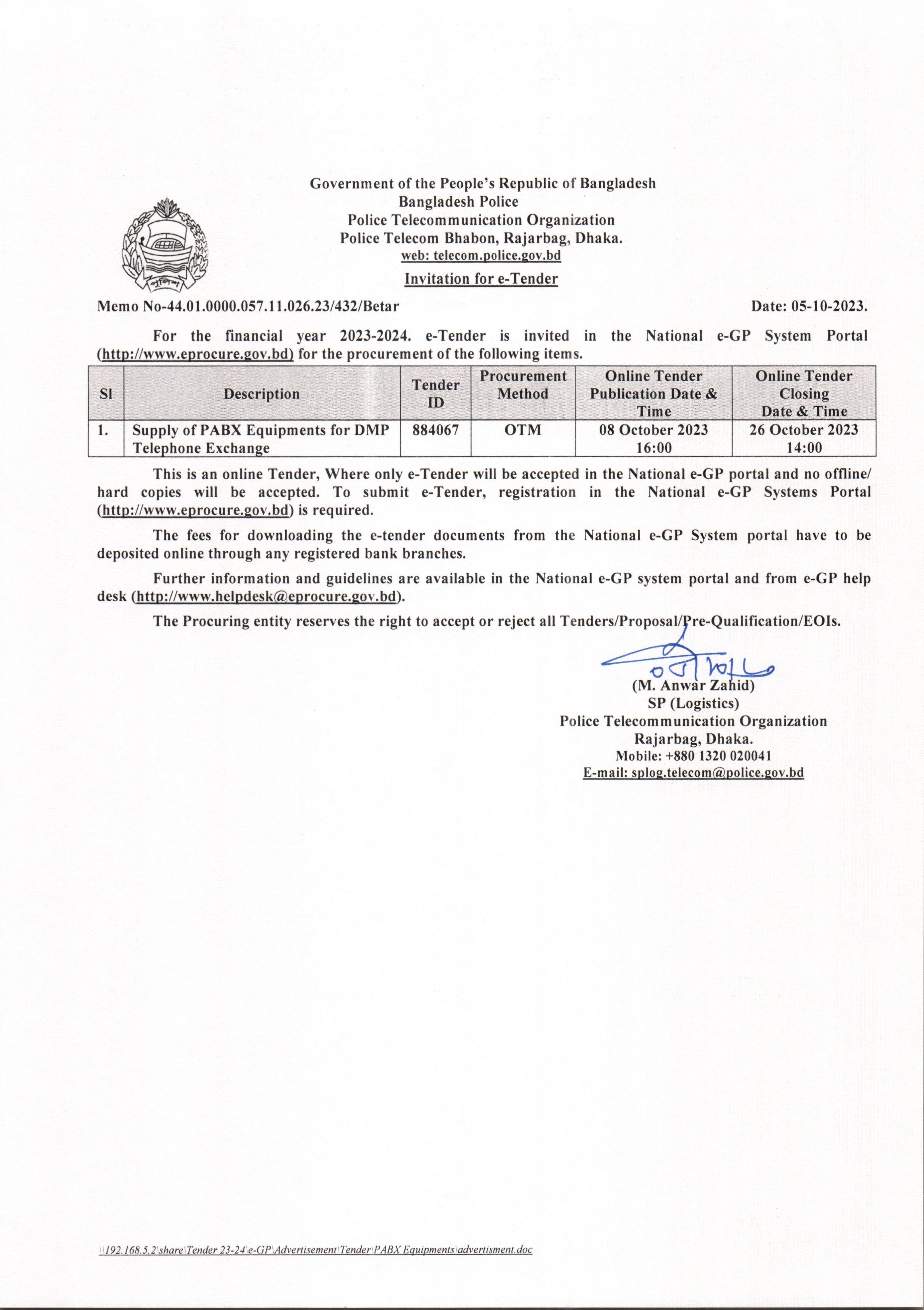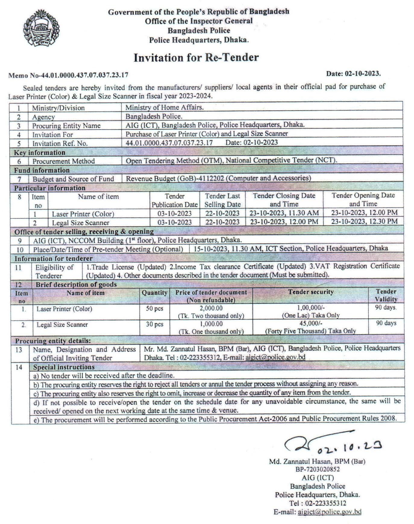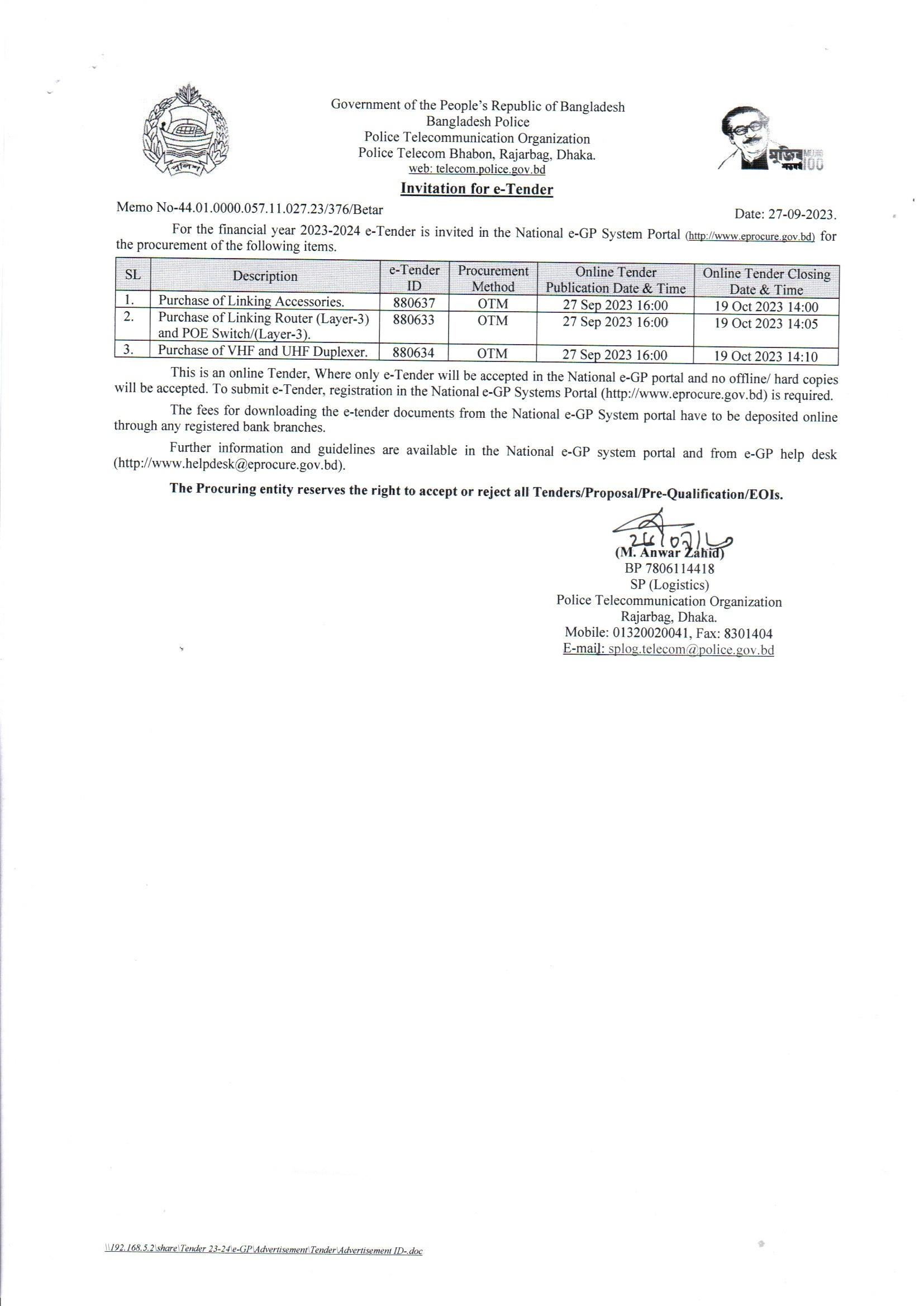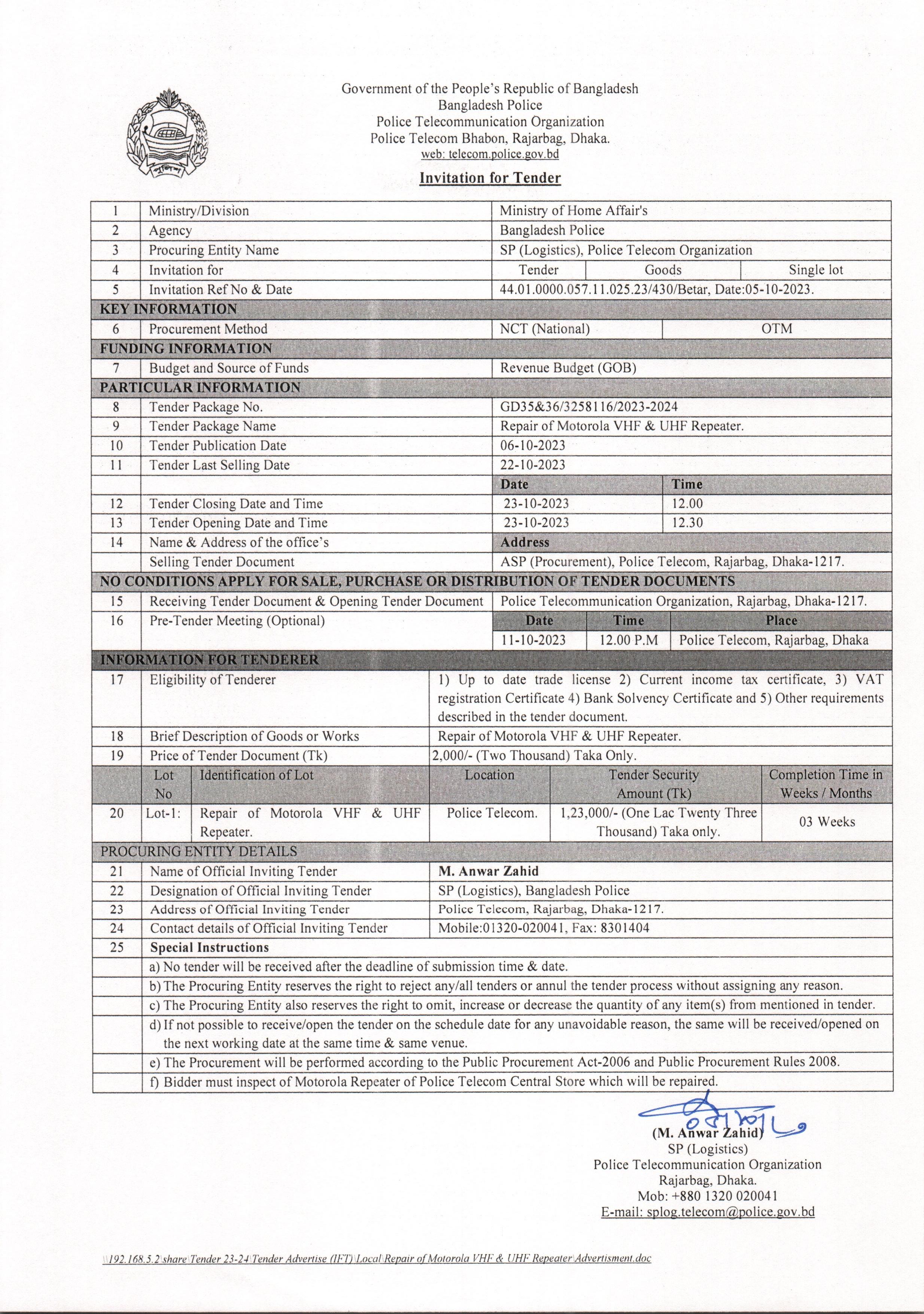| 742 | Invitation for Tender (Police Telecommunication Organization, Rajarbag, Dhaka), Memo No - 513. | 06-11-2023 | 06-11-2023 | View | Download |