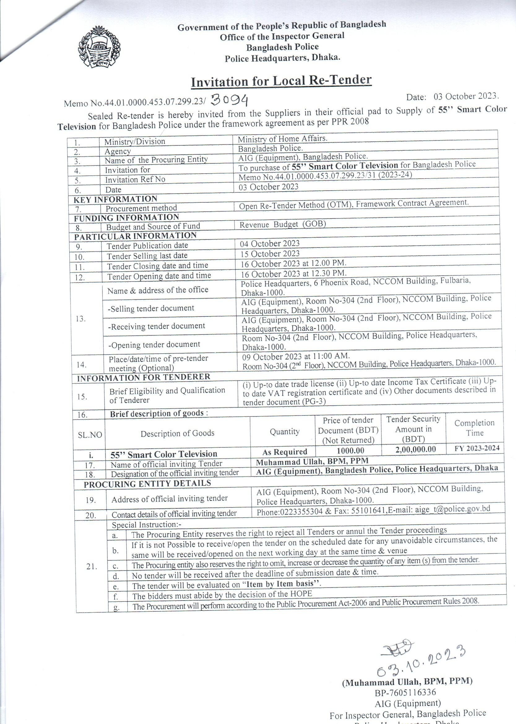| 748 | To Purchase of 55'' Color Television for BD Police (Equipment, PHQ, Dhaka) | 16-10-2023 | 16-10-2023 | View | Download |