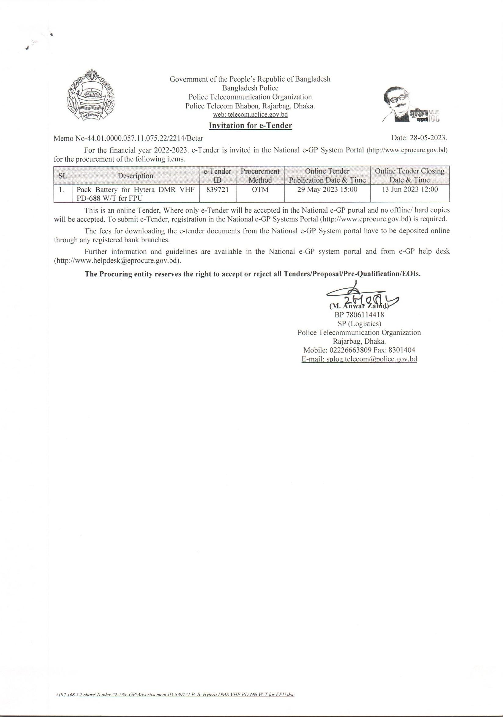 | 907 | Invitation for e-Tenders, (Telecom, Dhaka ) 2214 | 13-06-2023 | 13-06-2023 | View | Download |
