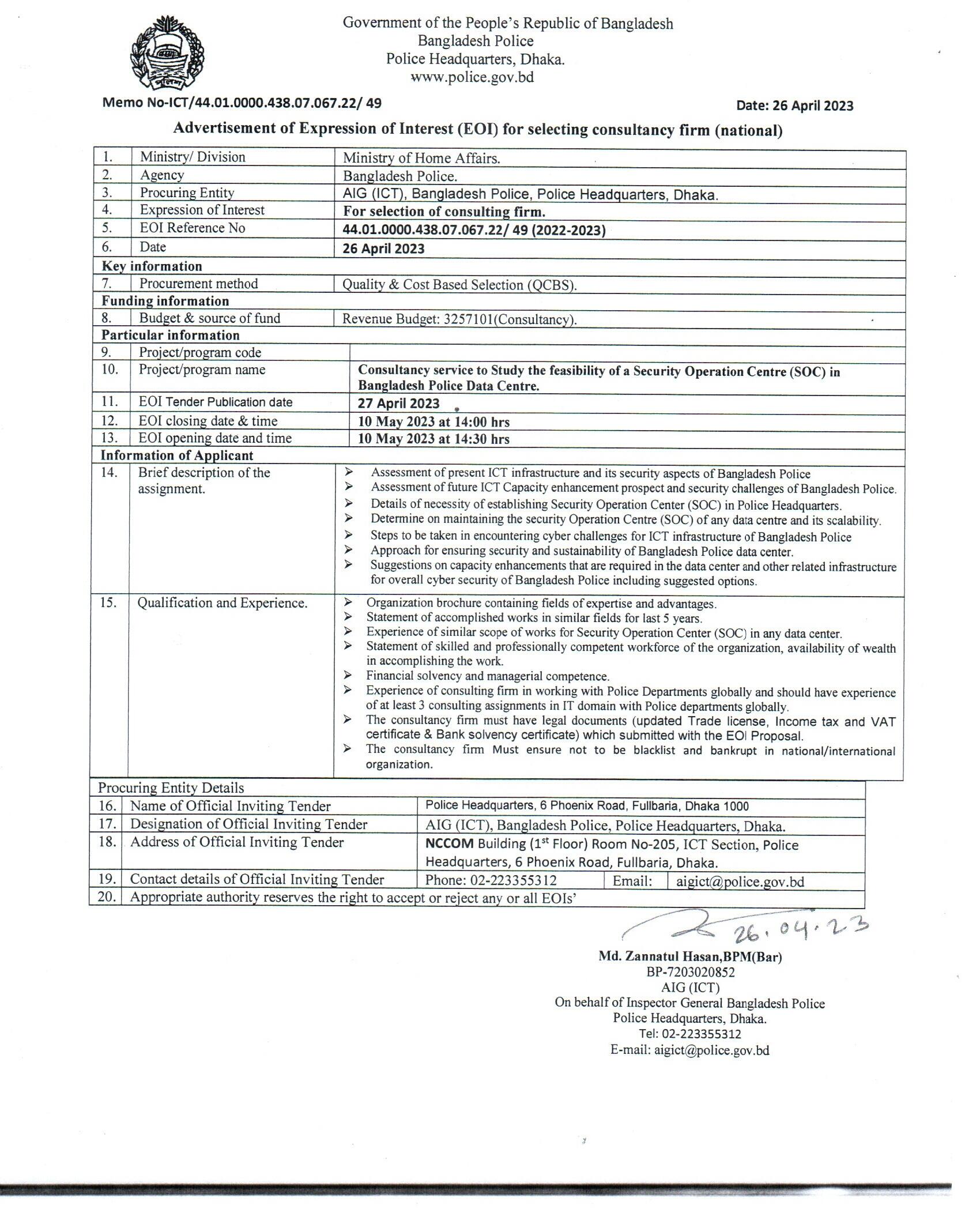 Advertisement of Expression of Internet (EOI) for Selecting Consultancy Firm (National) (ICT Section, PHQ, Dhaka ), Memo No - 49