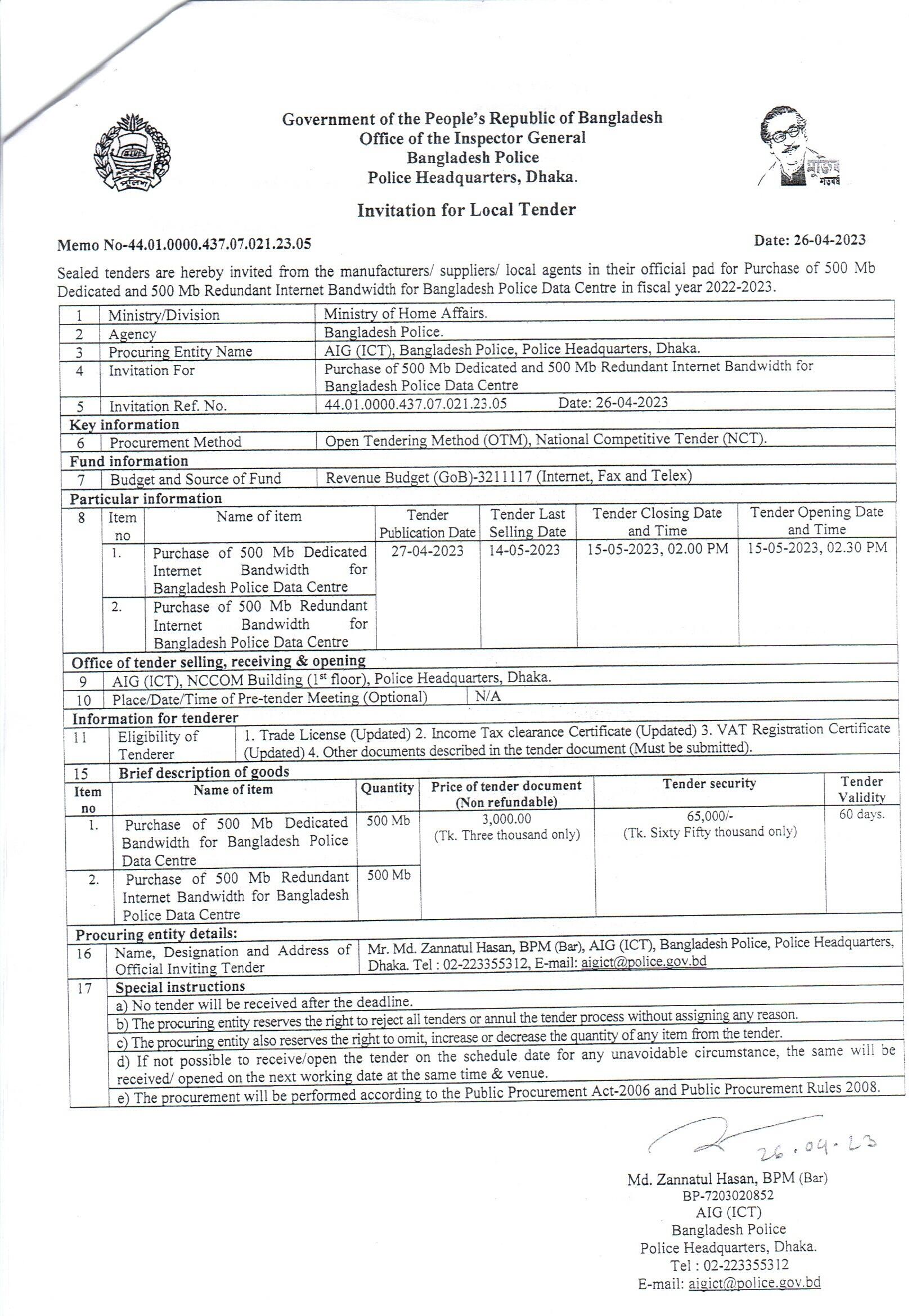 Invitation for Local Tender (ICT Section, PHQ, Dhaka ), Memo No - 05