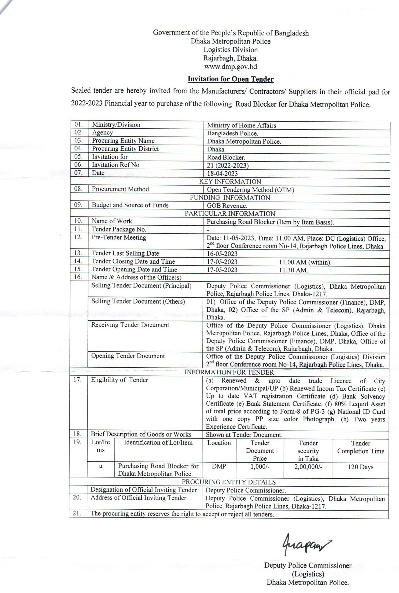 Invitation for Open Tender (Logistics Section, DMP, Dhaka ), Memo No- 21.