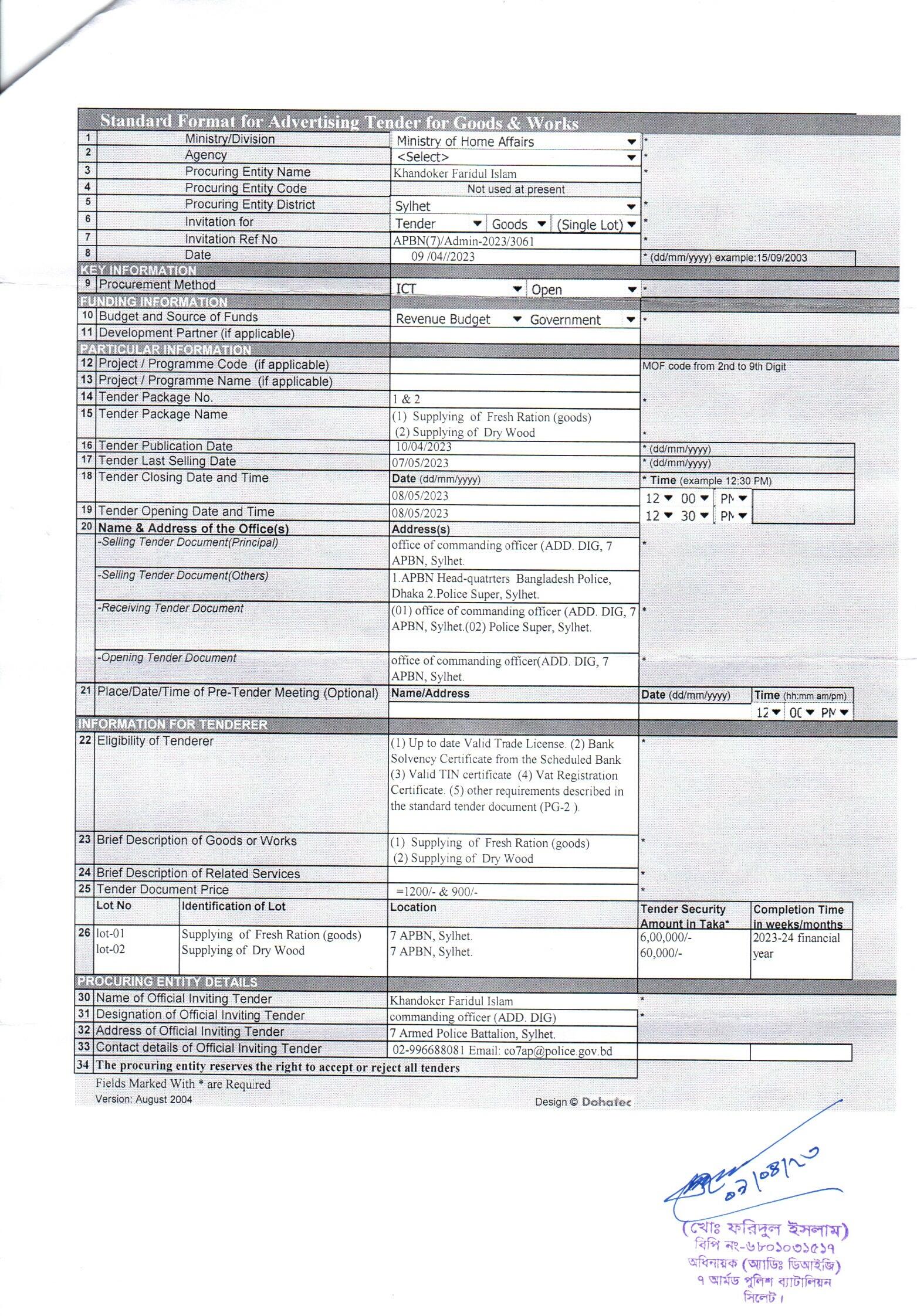 Advertising Tender for Goods & Works (7 APBn, Sylhet), Memo No - 3061).