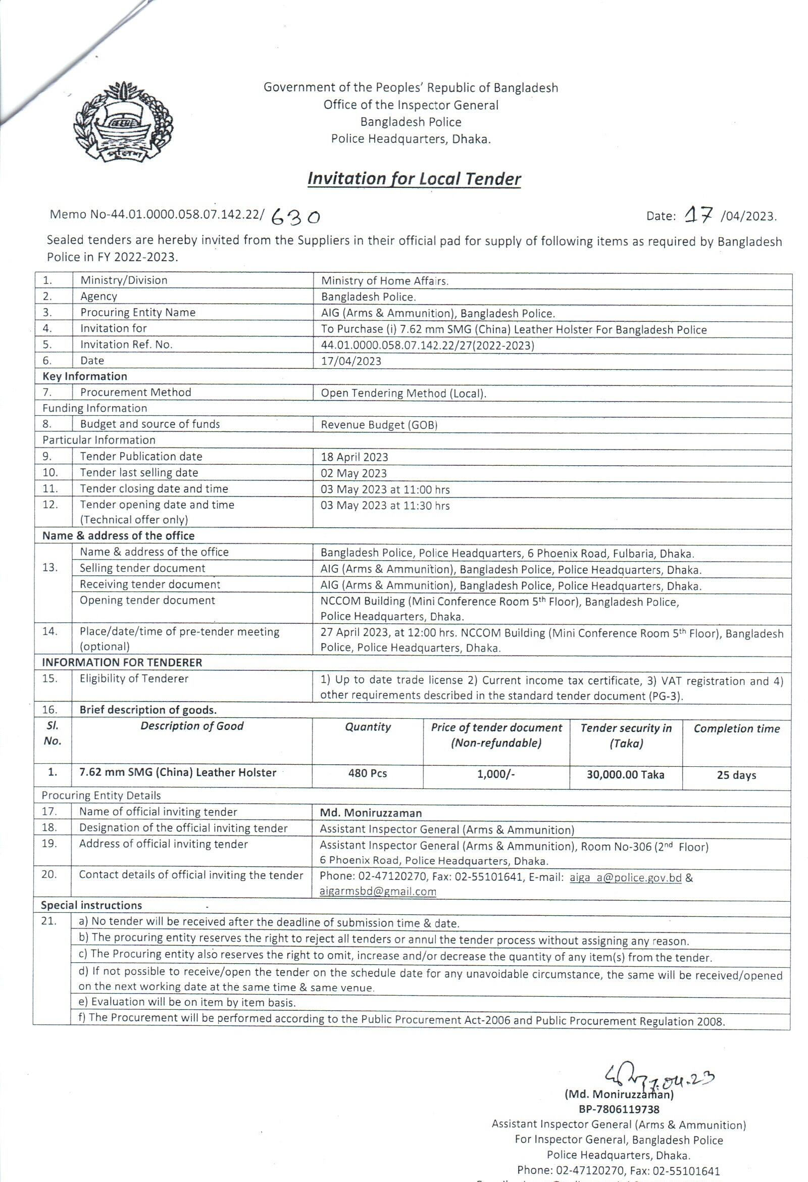 “দরপত্র বিজ্ঞপ্তি নং- ০১/২০২২-২০২৩” (পুলিশ সুপারের কার্যালায়, নীলফামারী), স্মারক নং- ১১৬৮/ই।