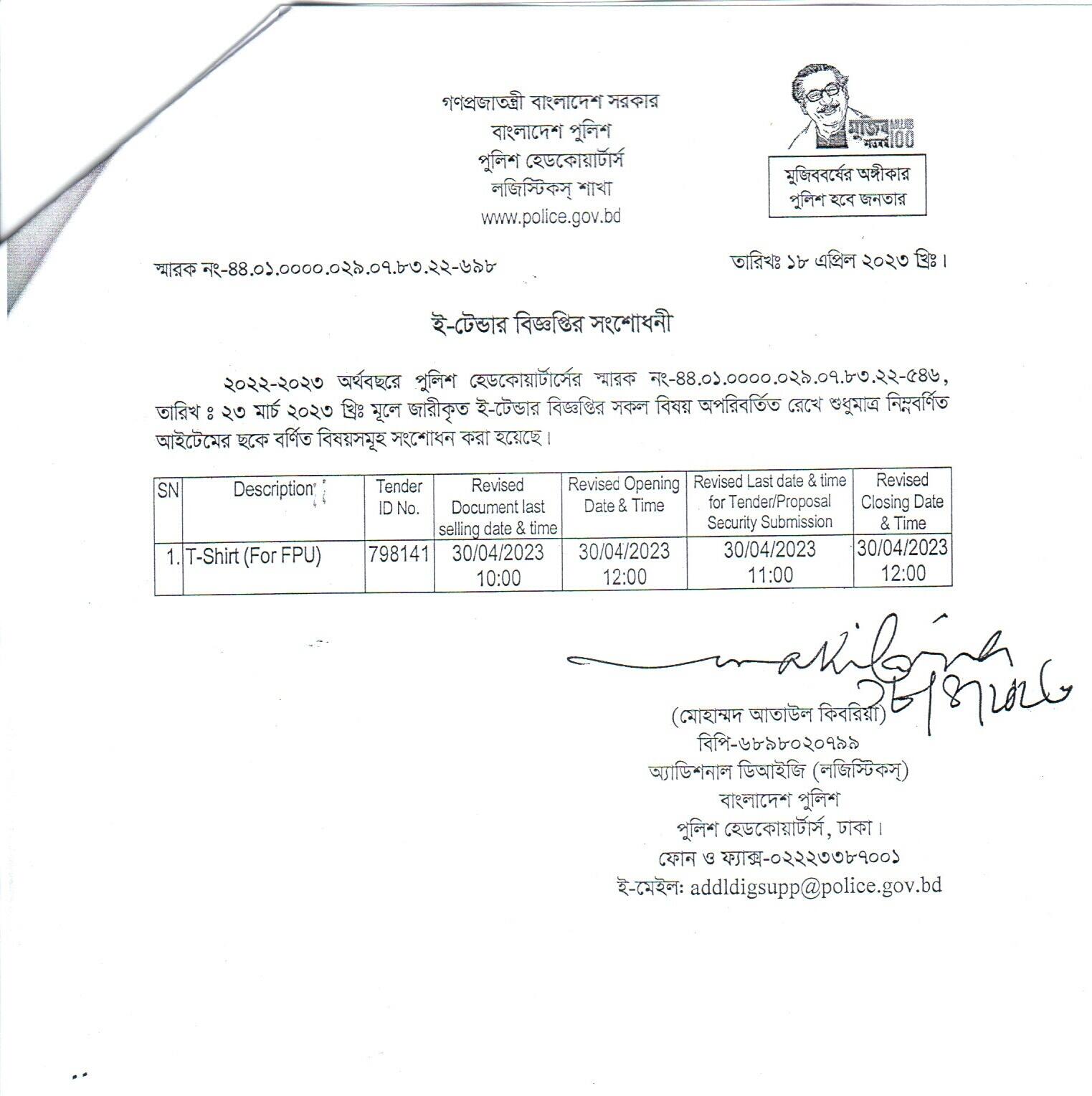 ই-টেন্ডার বিজ্ঞপ্তি সংশোধনী (Logistics, PHQ, Dhaka ), স্মারক নং- ৬৯৮।