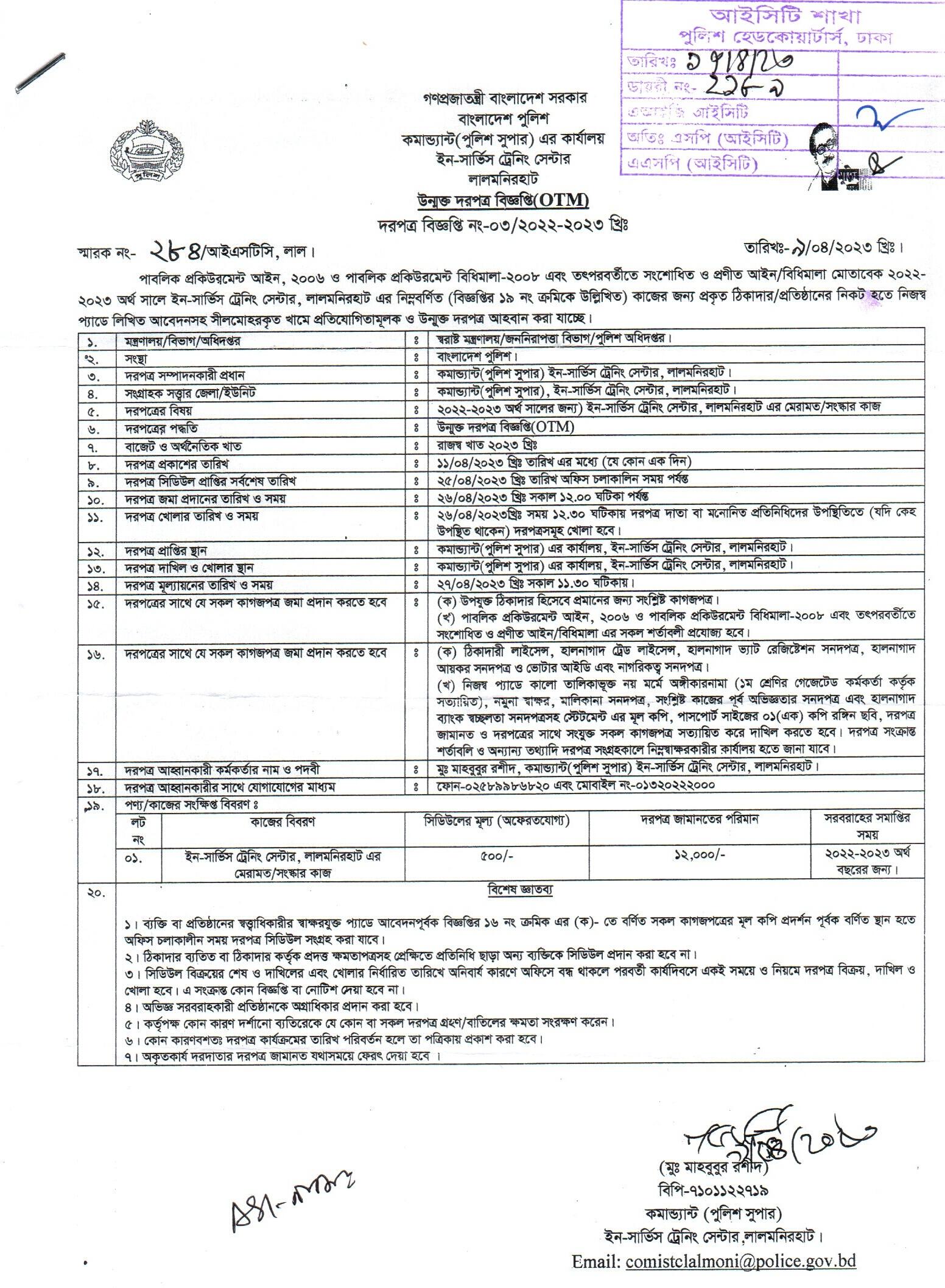 “উন্মুক্ত দরপত্র বিজ্ঞপ্তি (OTM) নং- ০৩/২০২২-২০২৩” (কমান্ড্যান্ট, ইন-সার্ভিস ট্রেনিং সেন্টার, লালমনিরহাট), স্মারক নং- ২৮৪।