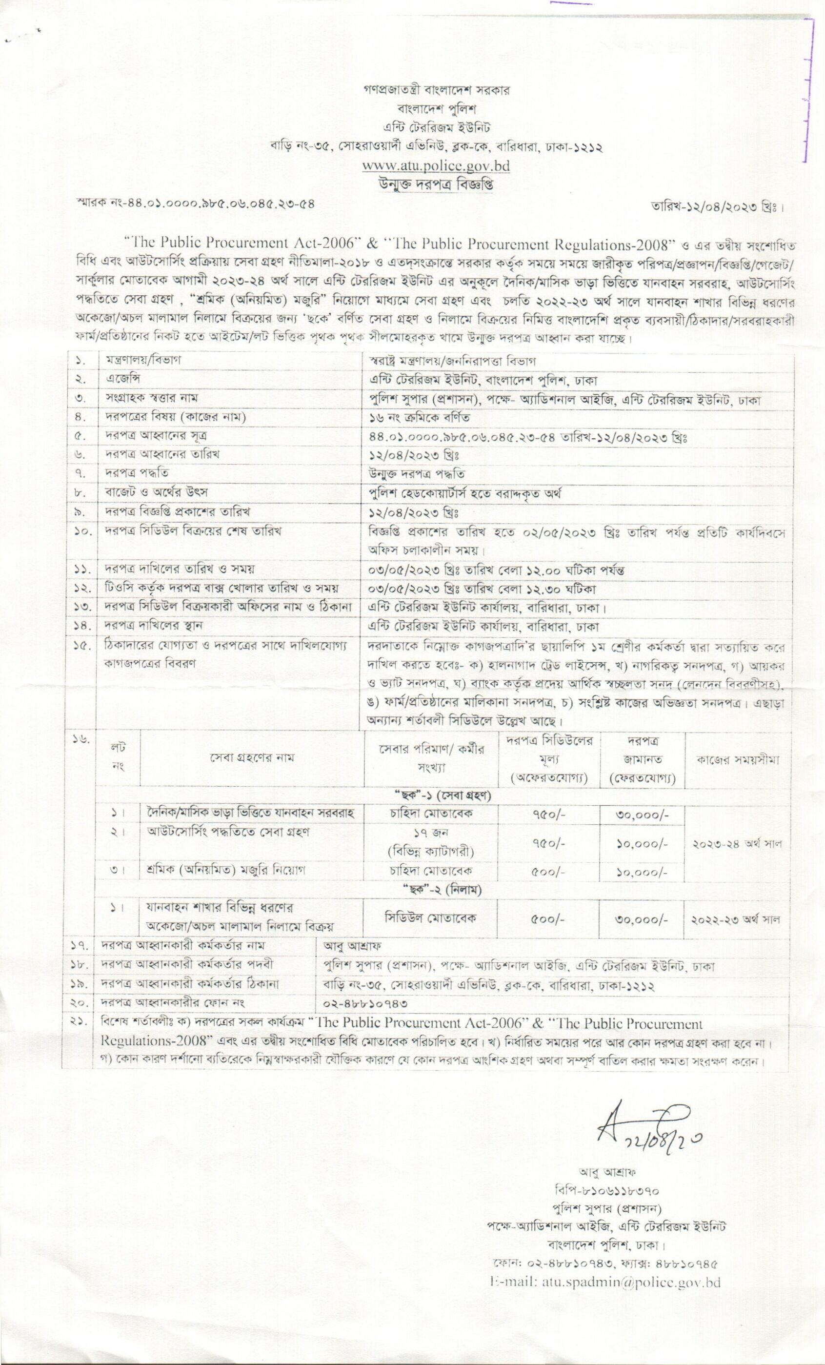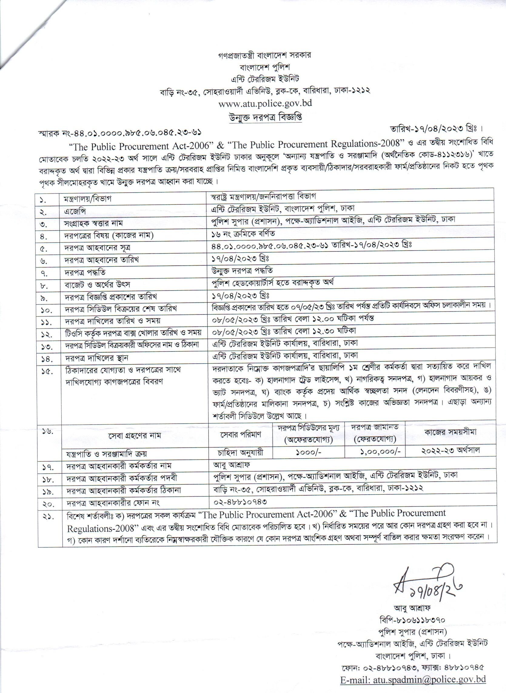“উন্মুক্ত দরপত্র বিজ্ঞপ্তি" (এন্টি টেররিজম ইউনিট কার্যালয়, বারিধারা, ঢাকা), স্মারক নং- ৬১।