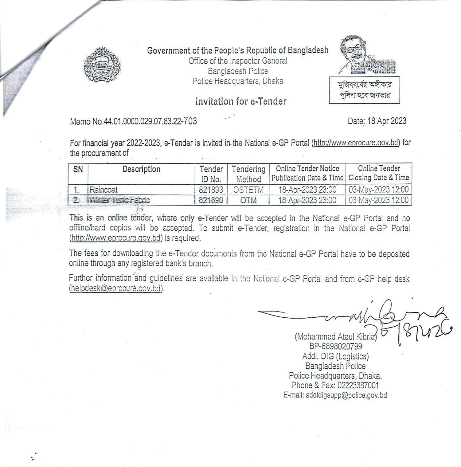 Invitation for e-Tender (Logistics Section, PHQ, Dhaka ), Memo No- 703.