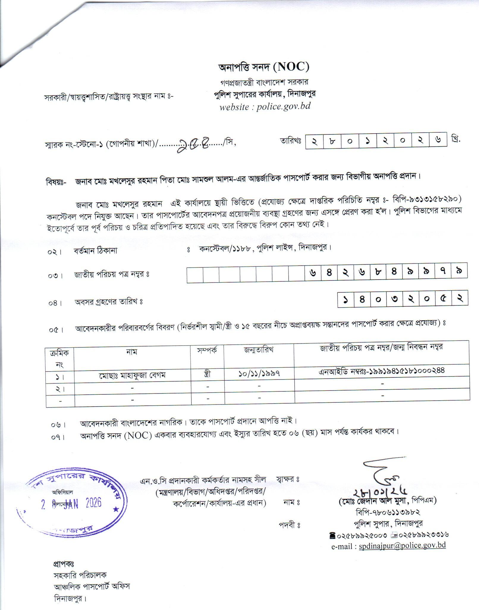 | 5 | মোঃ মখলেসুর রহমান, Cons | Dinajpur | 01-02-2026 | View | Download |