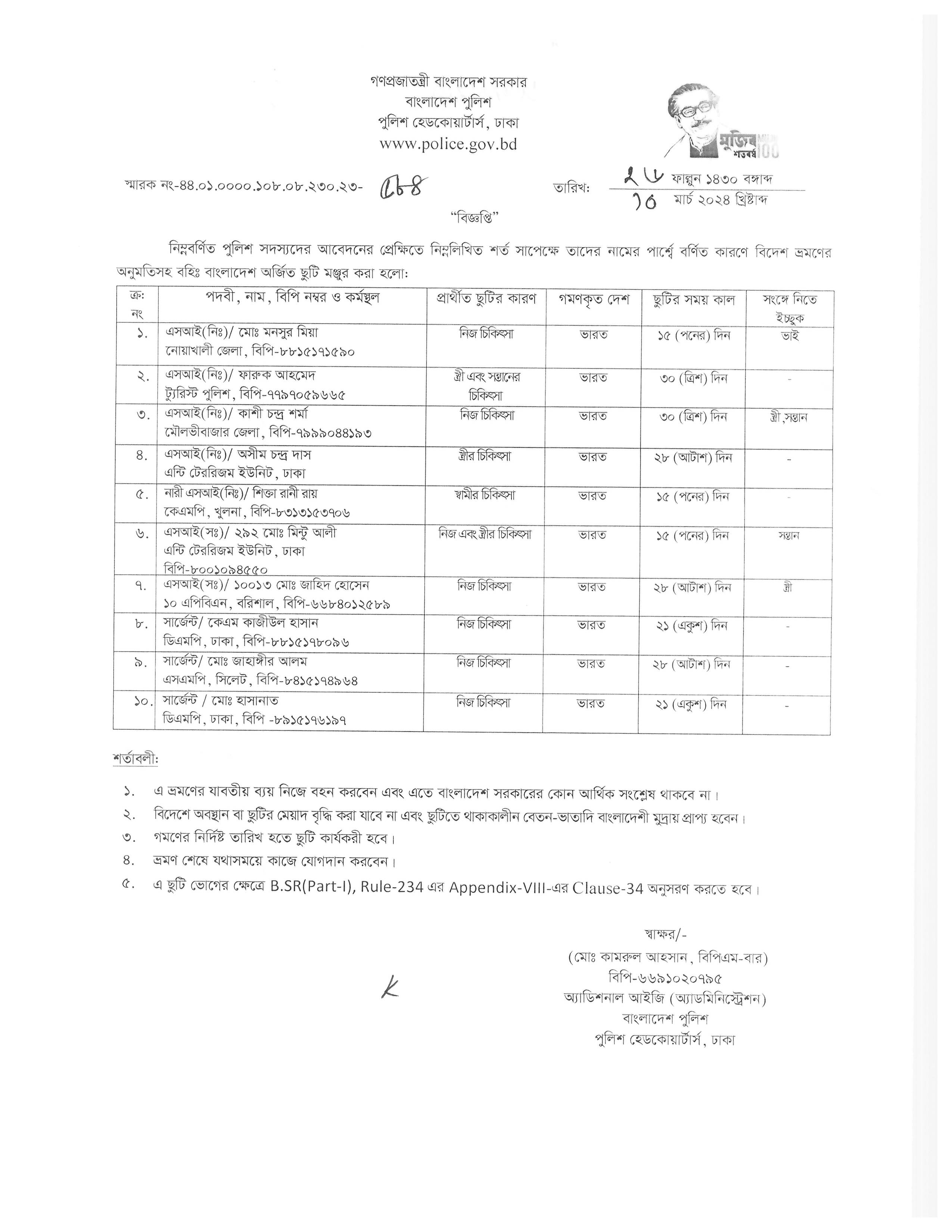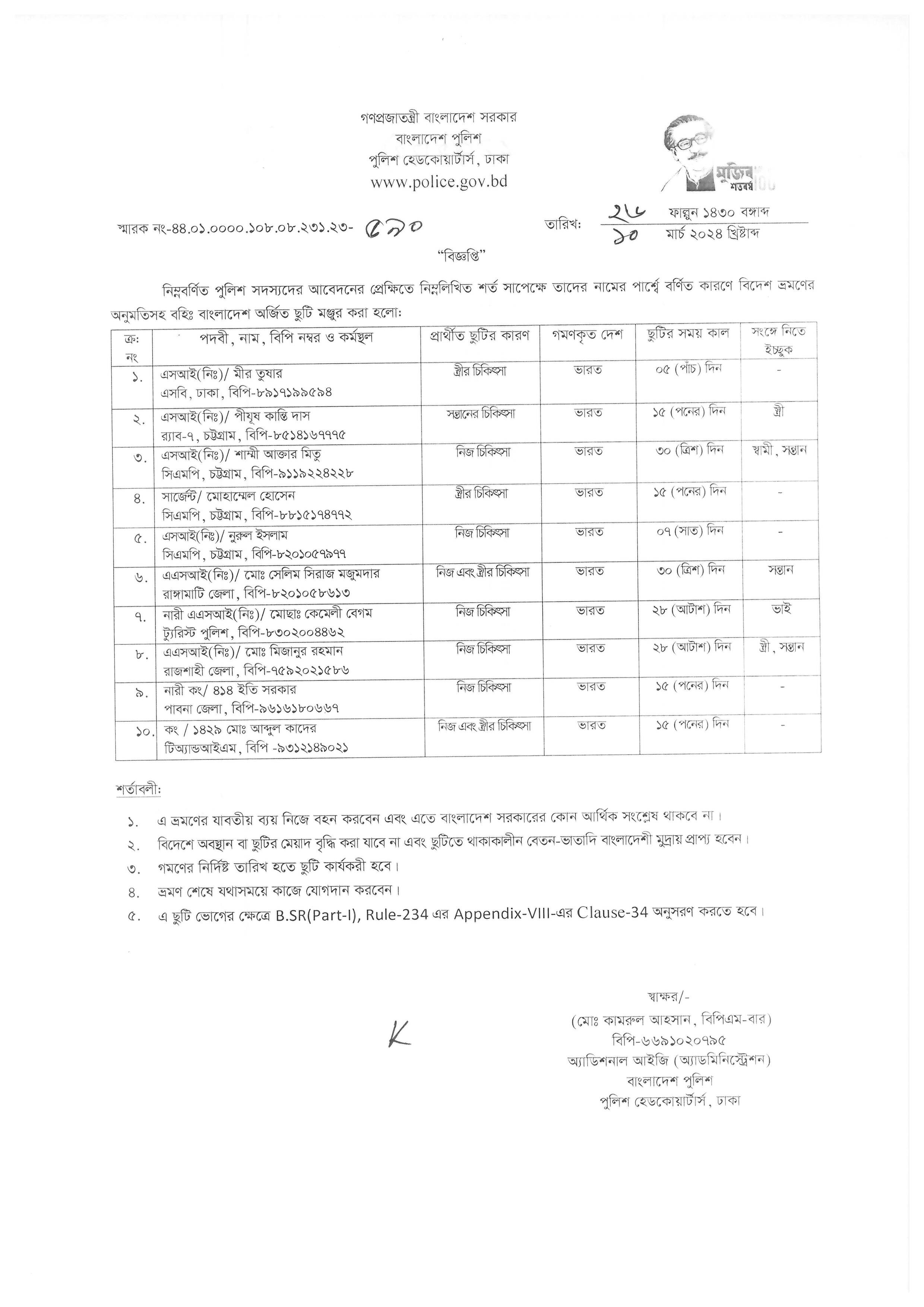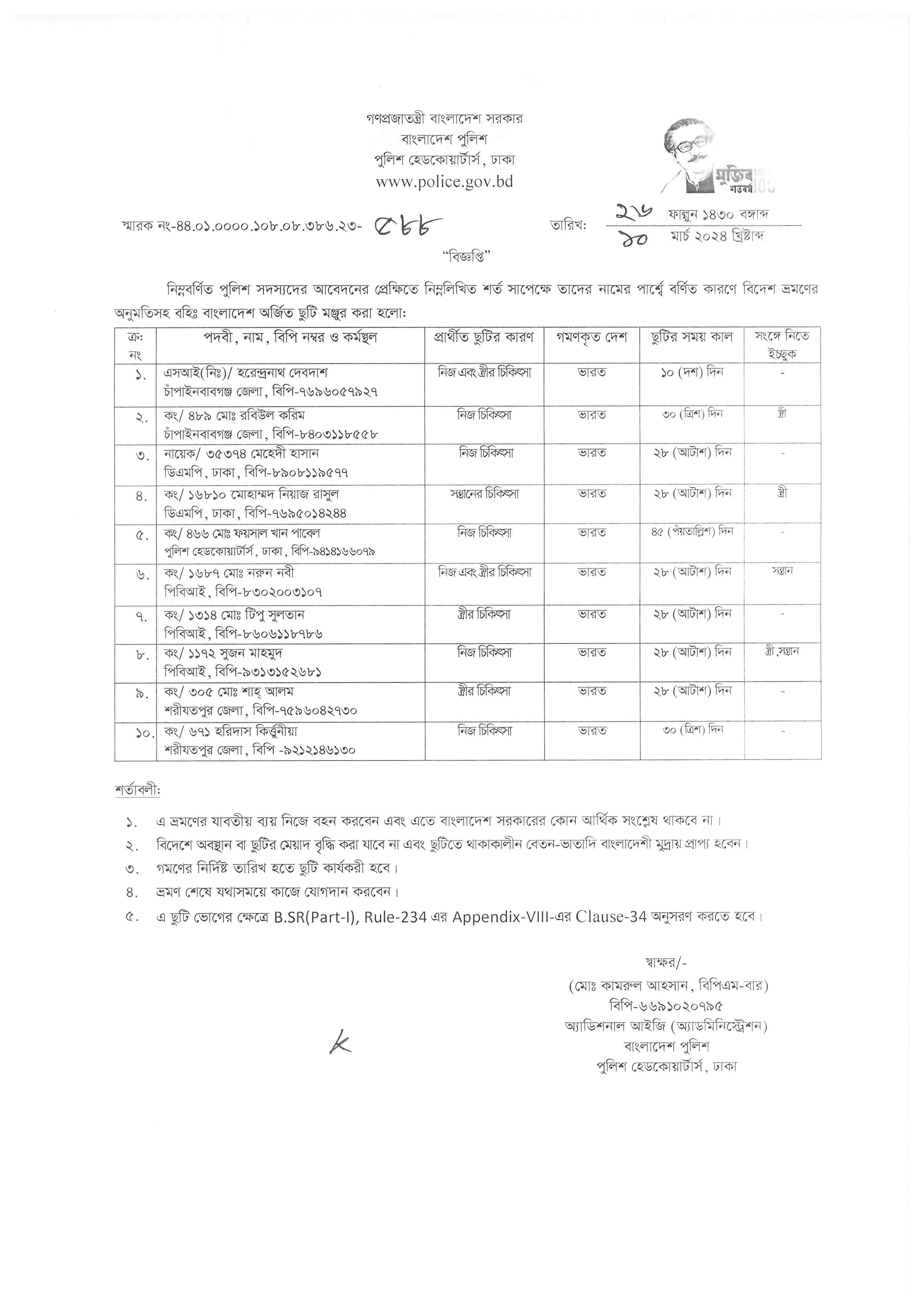 বহিঃ বাংলাদেশ ছুটি, বিজ্ঞপ্তি নং-৫৮২ , তারিখঃ ১০/০৩/২০২৪ খ্রিঃ।