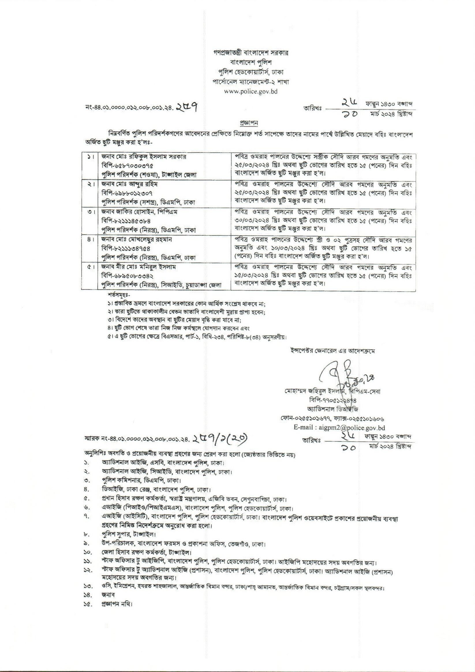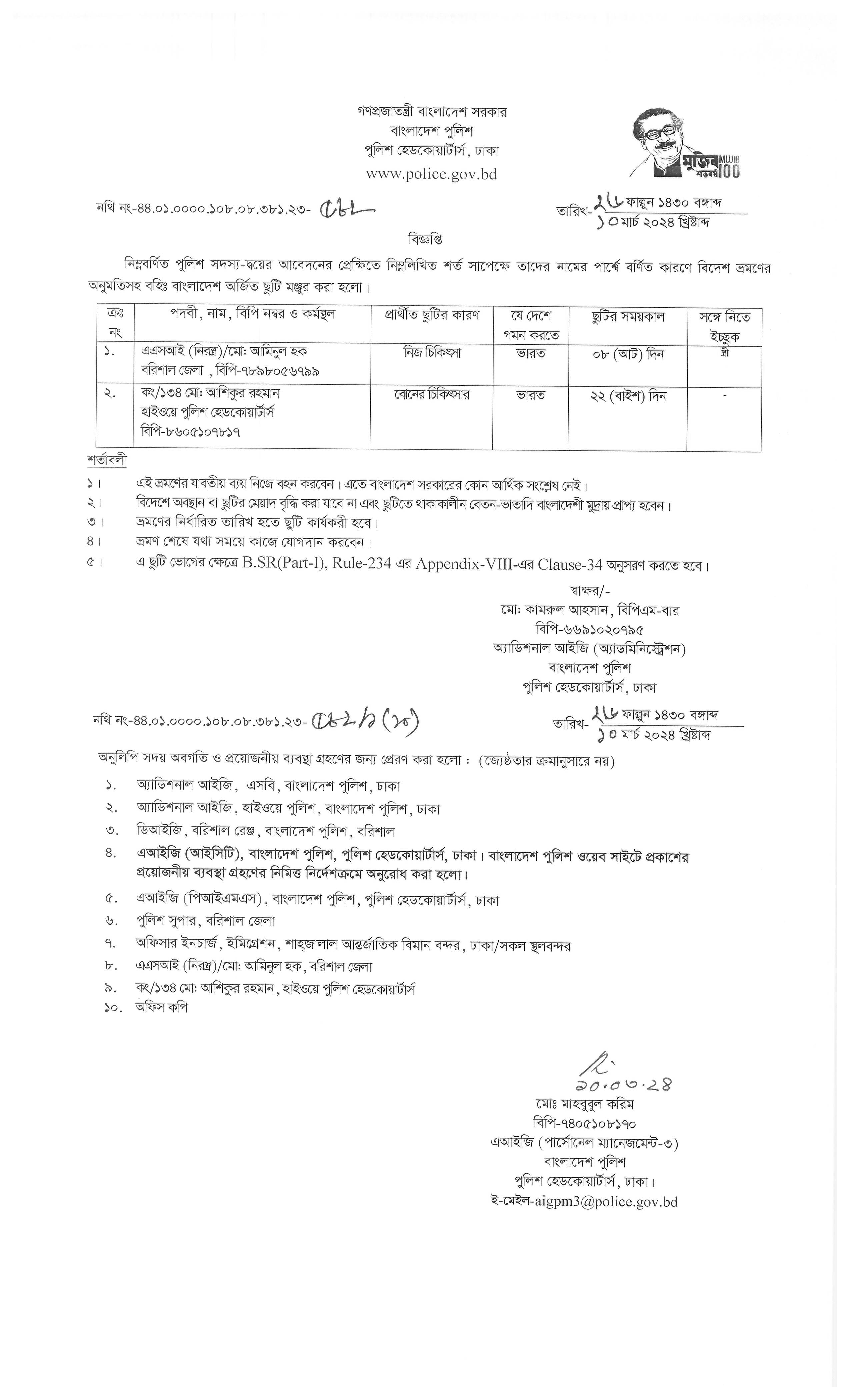 বহিঃ বাংলাদেশ ছুটি, বিজ্ঞপ্তি নং-৫৬৮ , তারিখঃ ০৪/০৩/২০২৪ খ্রিঃ।